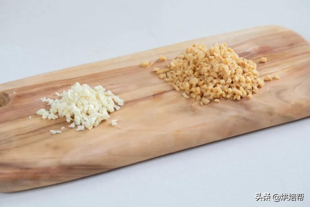 9、将菜脯切成末,3瓣大蒜切成蒜蓉。