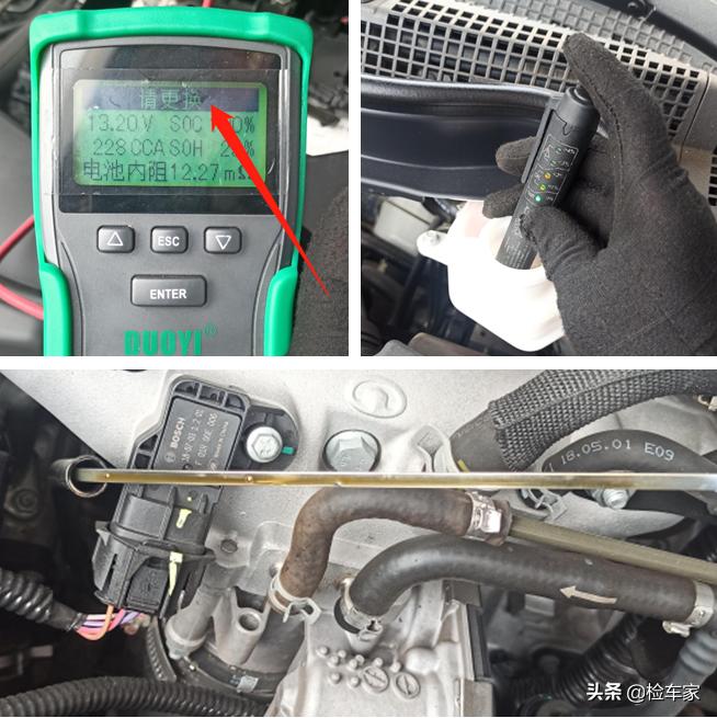 随后检测电瓶寿命以及全车油液:电瓶寿命不足需要更换了,刹车油含水量并未超标,机油看起来是刚换的一样,还可以继续使用。