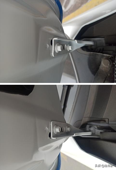 发动机盖两侧固定螺丝无拆卸痕迹,结合胶边焊点以及漆面数值可以确定为原厂机盖。