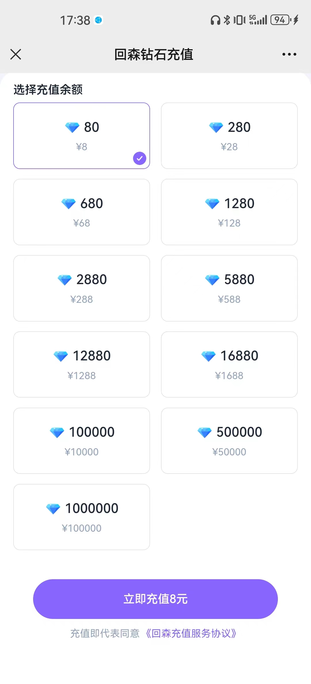 晨意帮忙记者下载了回森APP并进入一间歌房。记者发现,许多歌房写着“学生进”的字样。在歌房里,如果想要送礼,需要花费钻石来购买礼物。在直播间里,1枚钻石的价格是1毛, 1元钱起充。此外,通过微信搜索“回森充值”,搜索到名为回森APP的公众号,该公众号同样也能提供钻石充值服务,1688元可以购买16880颗钻石,最高可以单笔充值10万元。