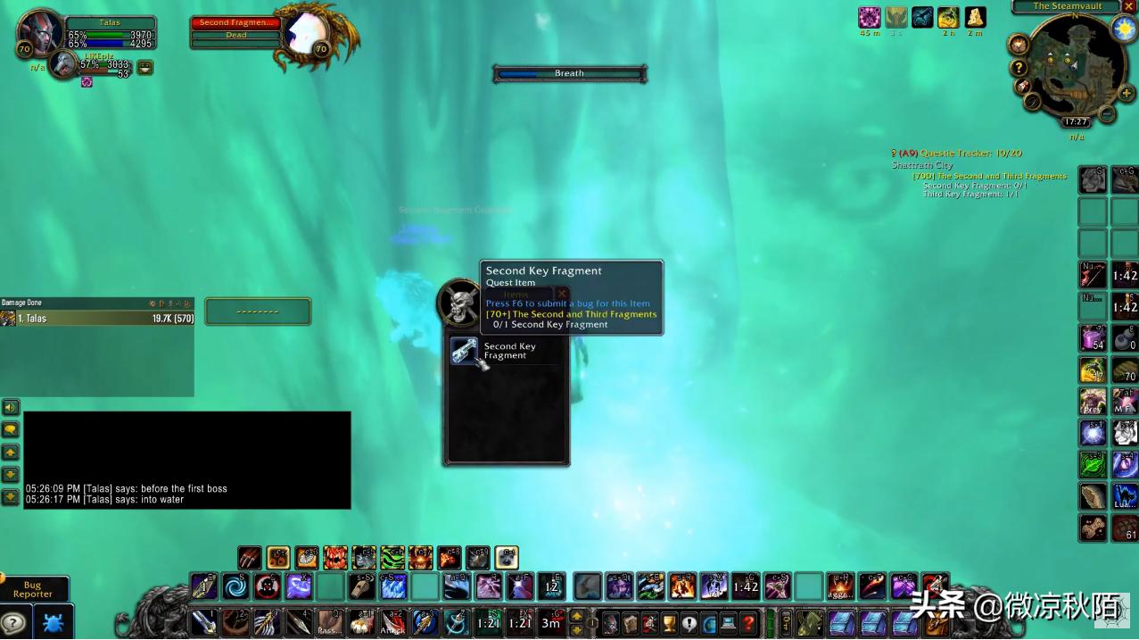 第二块碎片,在蒸汽地窟的一号BOSS旁边的水池,我们可以几个副本任务同时完成。先回到泰罗卡森林的火翼岗哨右边角落,坐标77:38找到“戴维·韦恩”,接任务“地下的土壤”(顺便可以把“大地之母的眼泪”任务接了,是去破碎大厅的任务)。在盘牙水库,还能从“观察者杰哈恩”接到“督军的末日”,此时进入“蒸汽地窟”,这几个任务可以同时完成,并且拿到卡拉赞第二个钥匙的碎片。