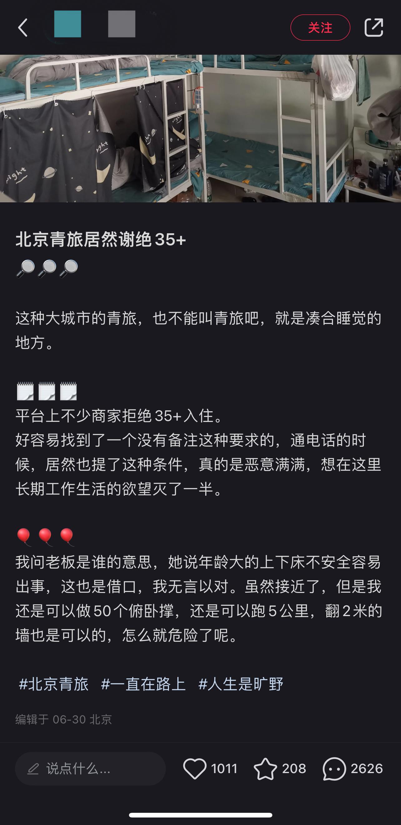 澎湃新闻(www.thepaper.cn)注意到,有网友在社交平台发帖吐槽,称北京青旅谢绝35+(年龄):“平台上不少商家拒绝35+入住,好容易找到了一个没有备注这个要求的,通电话的时候,居然也提了这种条件……我问老板是谁的意思,她说年龄大的上下床不安全容易出事,这也是借口,我无言以对……”