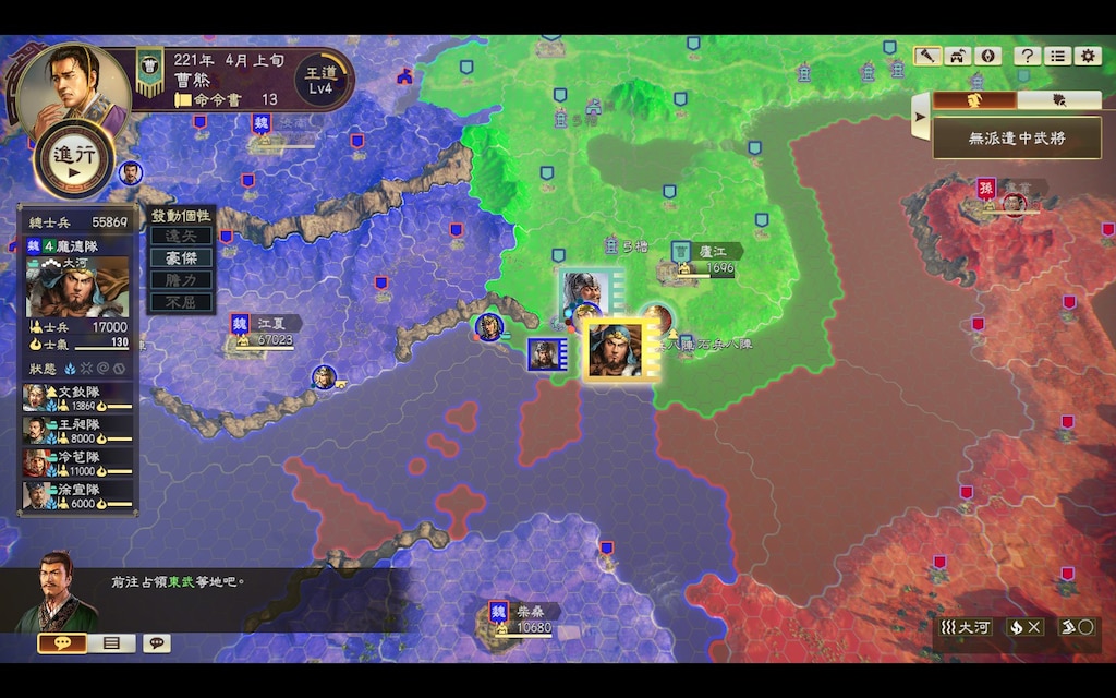 《三国志14》在君主制大战略方面的侧重还可以从游戏取消兵种的设定,采用阵形的设定取而代之看出端倪,这也就可以省去各个兵种分别升级的繁琐。不过在这方面的精简大有让人觉得精简过头的感觉,不过笔者认为还是可以接受的改动,毕竟在后期,各个城池事必躬亲般的管理起来实在是繁琐且拖沓,严重影响游戏体验。