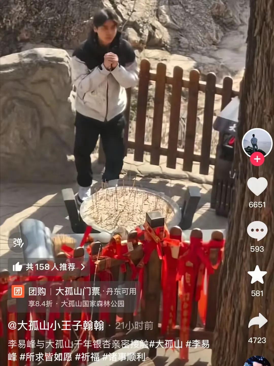 大孤山可不是一般的旅游地,这里有二十几座庙,平时求子、求姻缘、求学业财运的人特别多,很多明星也慕名而来。李易峰算得上是大孤山的“常客”了,正月还没结束就又来这儿了。这次他来,在千年银杏老树前,双手抱住树干,额头紧紧贴住,诚意满满地许愿,完了还绕树走了一圈。据说触摸这棵千年银杏树许愿,能给自己带来好运。除了这棵树,他还在香炉旁虔诚求愿,那场景看着还挺让人感慨的。
