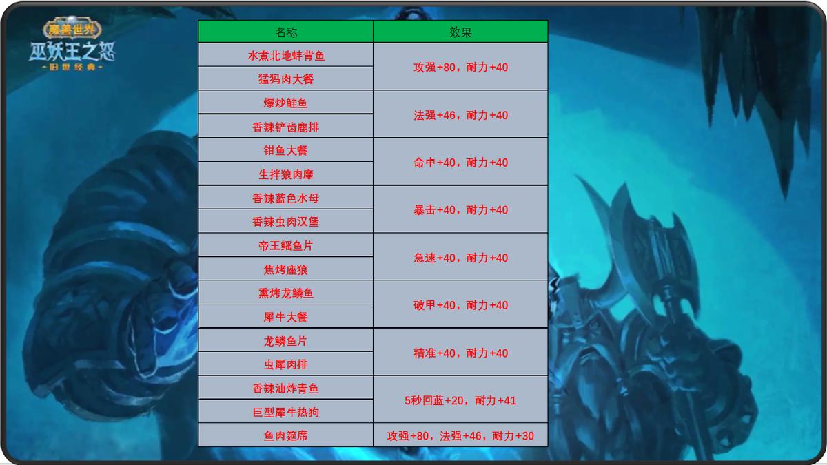 WLK版本的烹饪可以说是全面得到了加强,首先有全团食用的“鱼肉宴席”,其次还有各种属性加成和特效属性都是非常不错的美食,其中很多属性都是一样的烹饪,我们在选择的时候不妨多看一下,选择便宜的入手,不要花冤枉钱。下面我给大家奉上一张烹饪名称和效果相信图,希望对大家有所帮助,这里只给大家分享高级烹饪美食。
