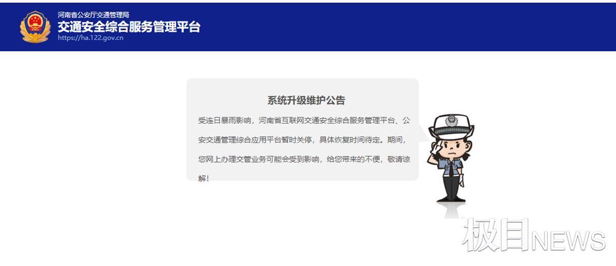 极目新闻记者试图打开河南省公安厅交通管理局交通安全综合服务管理平台的网站,但该网站显示,受连日暴雨影响,河南省互联网交通安全综合服务管理平台、公安交通管理综合应用平台暂时关停,具体恢复时间待定。
