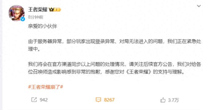 随后,王者荣耀紧急回应:由于服务器异常,部分玩家出现登录异常、对局无法进入的问题,我们正在紧急处理中。