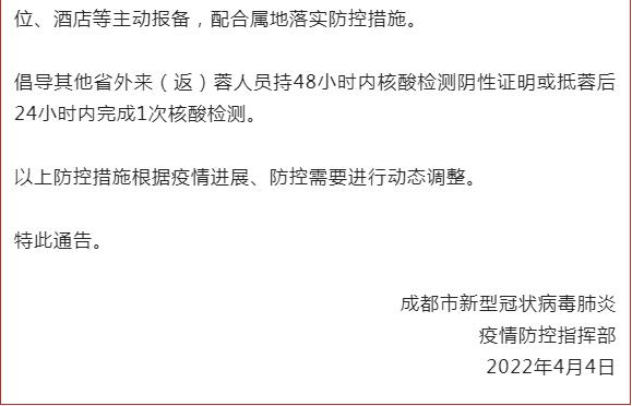从2022年4月5日6时起,离蓉人员须持有48小时内核酸检测阴性证明,并主动向机场、火车站、汽车站等场所工作人员出示健康码,同时做好个人防护措施。