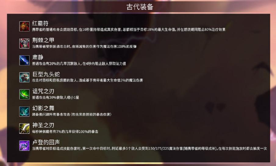 比如:红buff、肃静、荆棘之甲等,他们拥有更强大的效果,给特殊的英雄使用,会发生极为强大的技能效果。