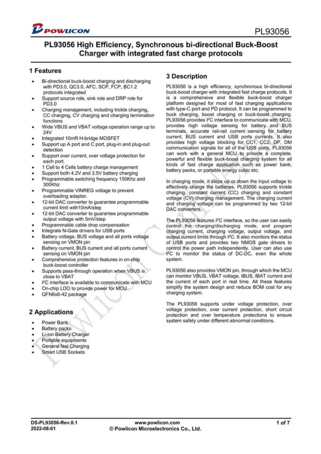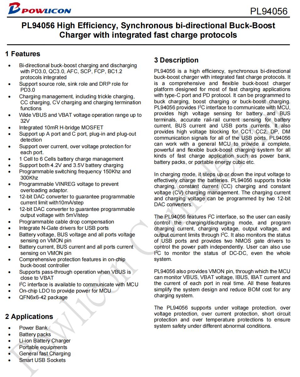 宝砾微PL94056是一颗集成升降压控制器、双向PD协议的SOC芯片,支持最高100W的移动电源产品采用,内置4颗全桥NMOS管,支持双向升降压、支持sink/source、1-6串电池充放电以及1A1C口的应用,专为使用Type-C端口和PD协议的快充应用而设计。