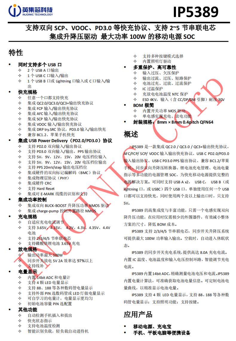 IP5389是一款支持多种快充协议,支持最大5节串联电芯,集成升降压驱动,最大输出功率100W的移动电源SOC芯片。