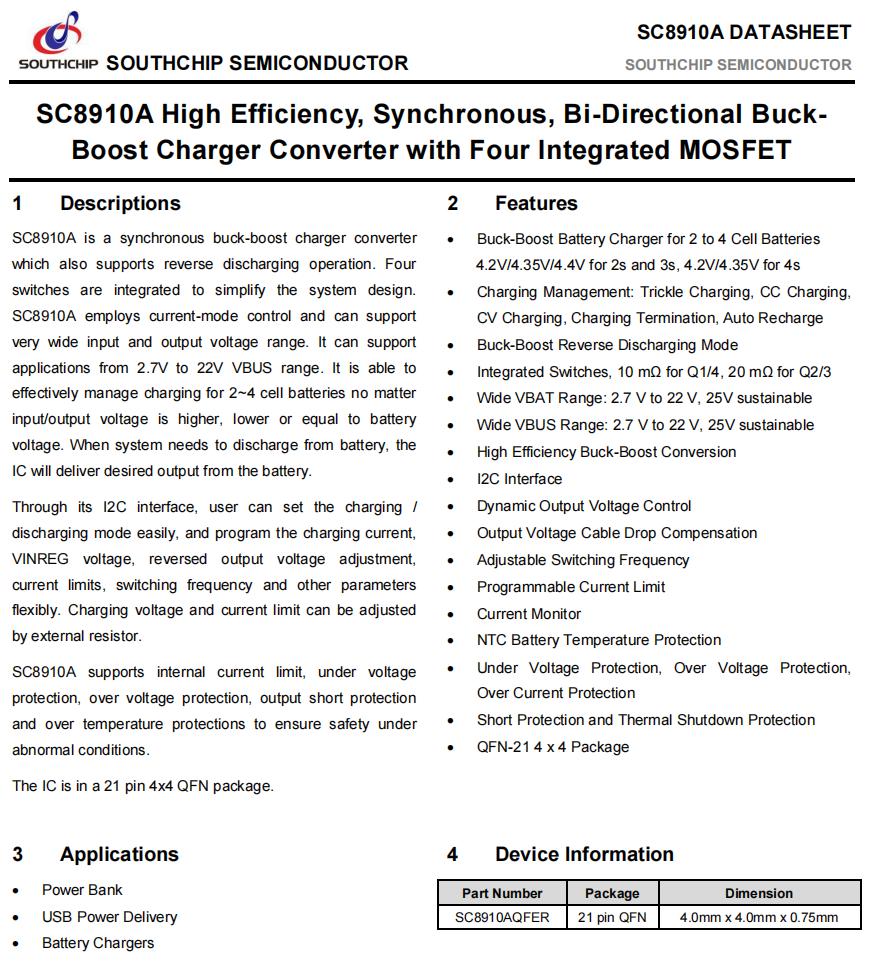 SC8910A是一款高效同步升降压转换器芯片,同时支持反向放电操作。内部集成了四个MOS管开关,简化了系统设计流程。SC8910A采用电流模式控制,能够灵活适应广泛的输入和输出电压范围,覆盖了2.7V至22V的VBUS范围。它能够有效地管理2到4节电池的充电,无论输入/输出电压高于、低于还是等于电池电压。在需要从电池放电时,IC能够按需从电池中提供所需的输出。