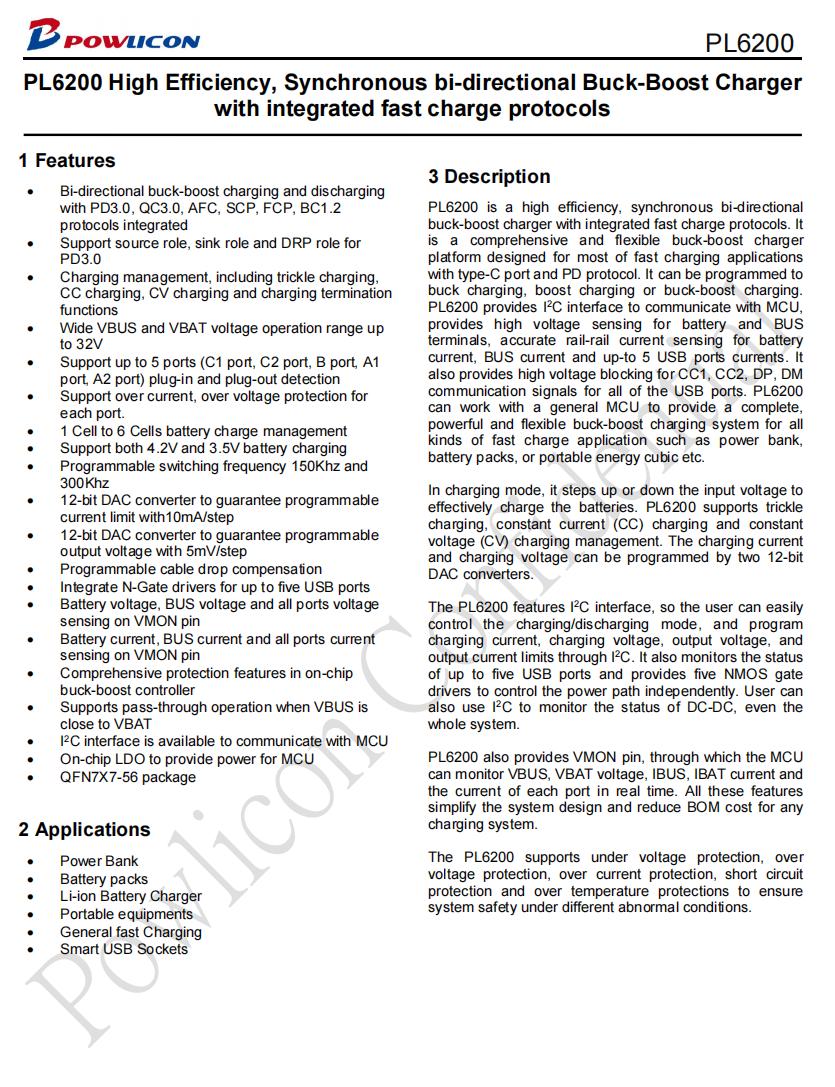 PL6200支持市场上主流的快充协议,包括PD3.0、FCP/SCP、AFC、BC1.2、QC3.0等。其VBUS和VBAT电压操作范围广泛,高达32V。此外,它还并能够对1节至6节电池进行充电管理,支持为4.2V和3.5V电池充电,并且可编程开关频率为150KHz至600KHz。