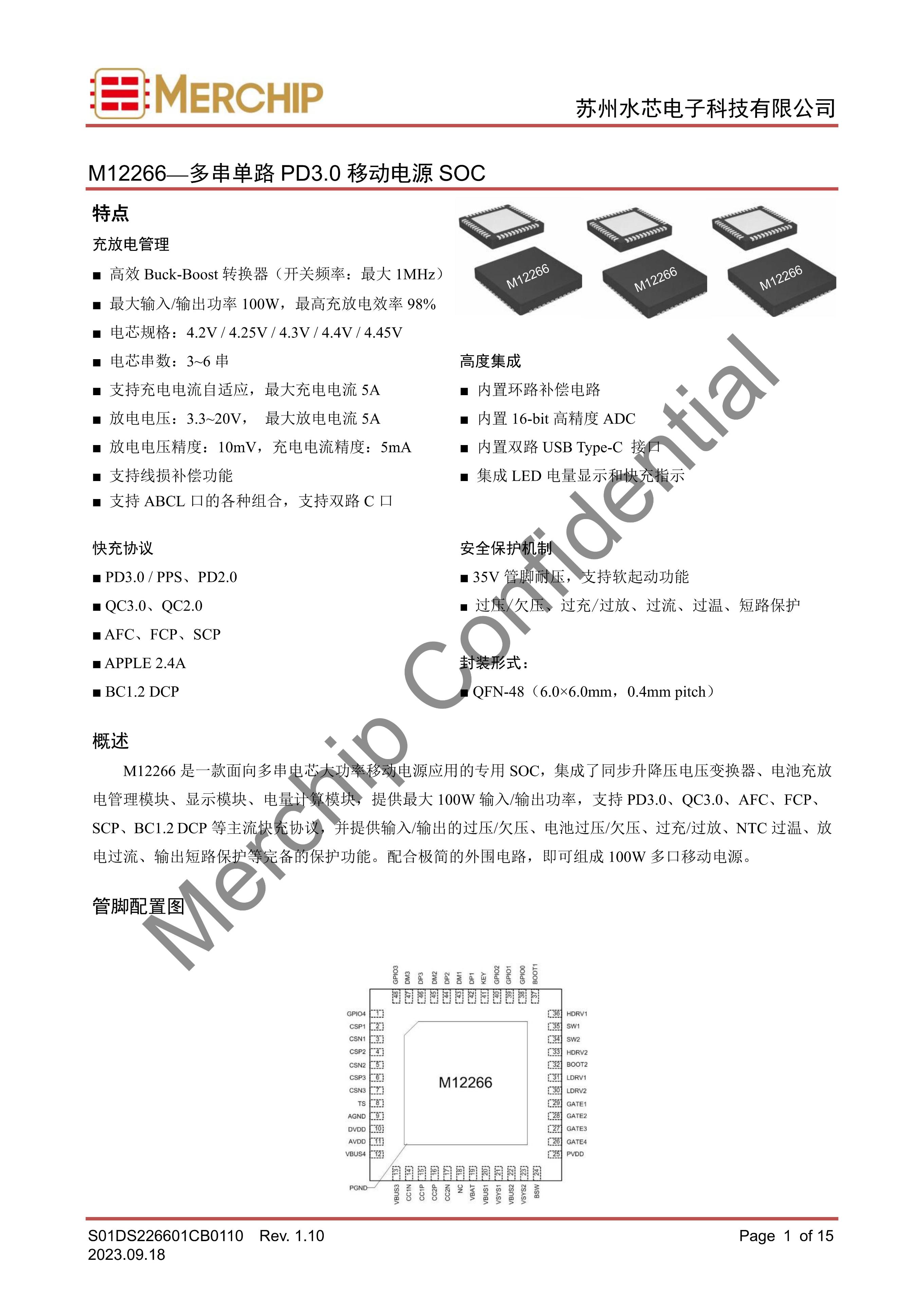 M12266H是一款面向多串电芯大功率移动电源应用专用SOC,内部集成最大开关频率1MHz的同步升降压变换器,最大输出/输入功率为100W,支持PD3.0等多种市面主流快充协议,具备过欠、过压等功能完备的保护功能,内置环路补偿电路、16bit高精度ADC,并集成电量显示和快充指示功能。