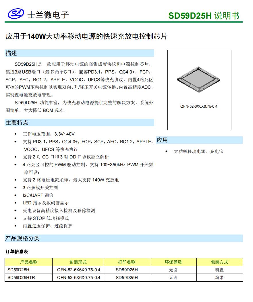SD59D25H支持STOP低功耗模式,内置过压、过流保护,采用QFN52 6x6x0.75 0.4pitch封装,适用于大功率充电宝中。