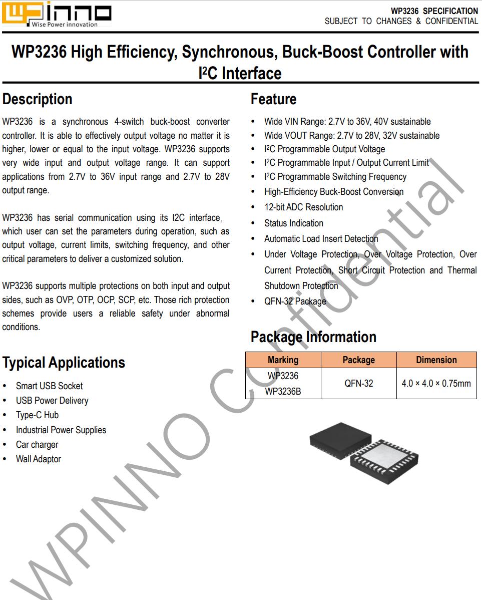 WP3236是一款同步的4开关升降压转换控制器芯片,支持PD3.1,无论输出电压是高于、低于还是等于输入电压,它都能有效地输出所需电压。