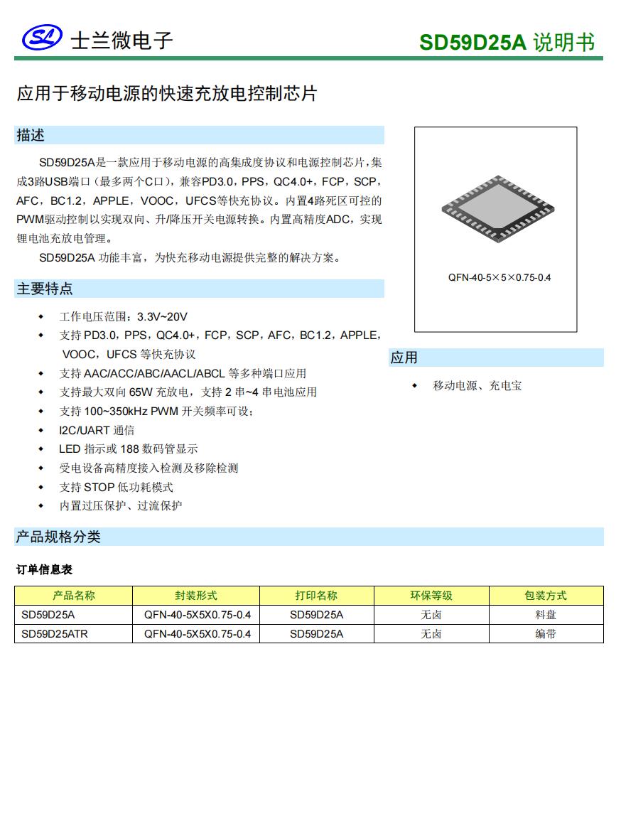 SD59D25A 功能丰富,采用QFN40封装,内置过压保护、过流保护,可为快充移动电源提供完整的解决方案。