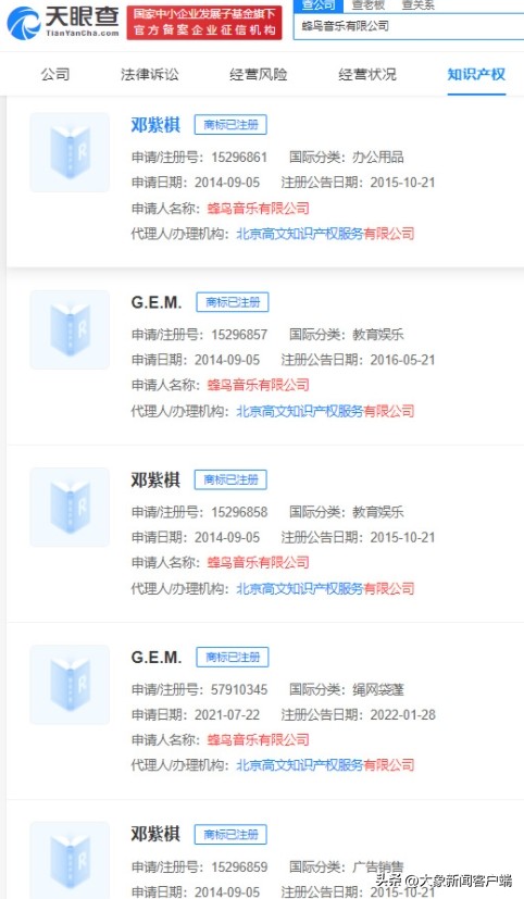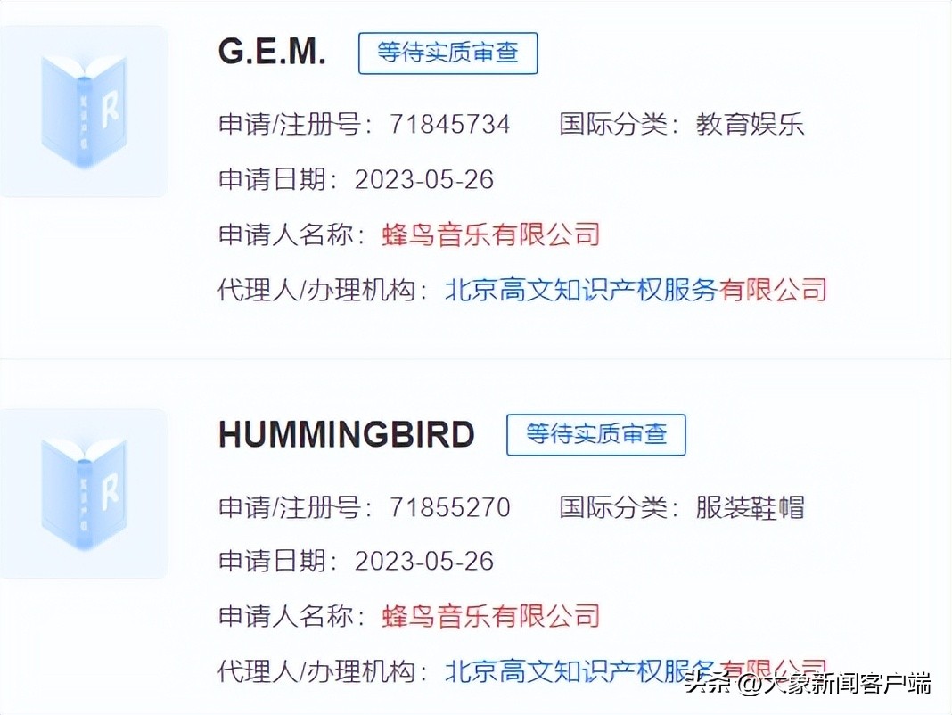 而天眼查显示,蜂鸟音乐去年仍在申请邓紫棋商标。