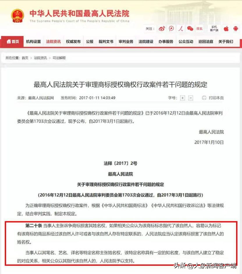 涉及姓名权的商标授权争议,最高法出台过专门的司法解释:“当事人以其笔名、艺名、译名等特定名称主张姓名权,该特定名称具有一定的知名度,与该自然人建立了稳定的对应关系,相关公众以其指代该自然人的,人民法院予以支持。”