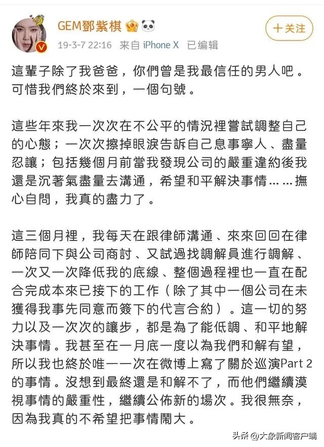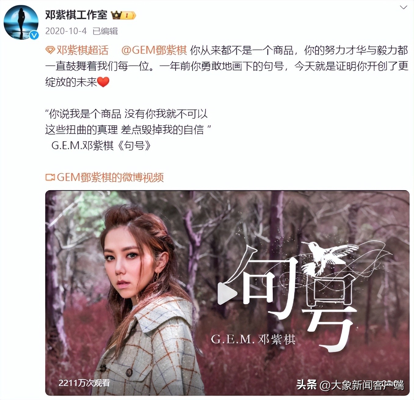 蜂鸟音乐微博此前停更在2019年4月8日,那时邓紫棋刚与它决裂一个月,它发长文《致G.E.M.的歌迷》,称所认识私底下的G.E.M.是一个开心、单纯、努力、有点爱耍赖的人。跟她的12年工作过程中绝大部分时间都是坦诚的,这一两年有了分歧。
