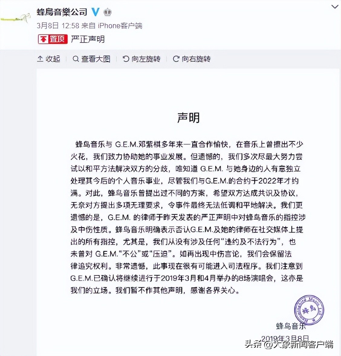 蜂鸟音乐很快发声明,否认自己违约,表示邓紫棋对公司有“中伤”言论,说尽管和邓紫棋的合约到2022年才到期,但仍决定要走法律程序。