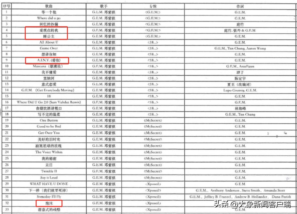声明附录的表格里,列出了103首歌曲,过半歌曲均有邓紫棋参与创作,包括《爱现在的我》《睡公主》《泡沫》等。