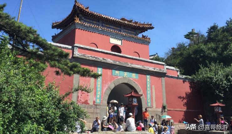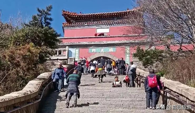 泰山南天门,又名三天门,海拔1460米,山于此为最危耸。南天门位于十八盘尽头,是登山盘道顶端,座落在飞龙岩和翔凤岭之间的山口上。由下仰视,犹如天上宫阙,是登泰山顶的门户。创建于元至元元年(1264年),明清多次重修,建国后又翻修两次。建筑保持了清代的风格。