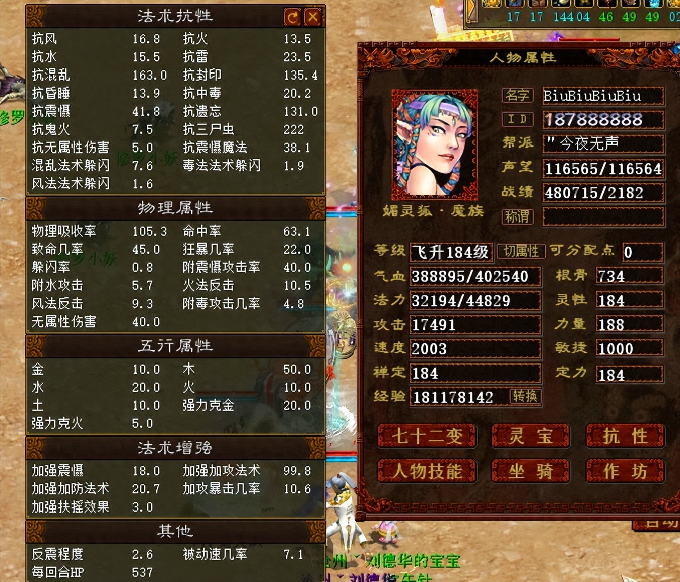 对于魔族这个种族来说,速度在某些时候是第一要务,一些喜欢打PK的敏魔,速度甚至可以堆到4000以上,如果敏配饰搭配满默契的情况下,敏魔的速度在2500左右也是不难实现的,一些二三线的队伍中,3000速度的敏魔更是司空见惯,那么敏血魔大家见过吗?眼前这位女魔,2003的速度,40万的气血,而在他的抗性属性中,却找不到有神兵“凤翅瑶仙簪”的痕迹。那么,他是如何在2000速度的状态下,还可以搭配出40万的气血呢,并且气血还不是重点,重点在法术增强上,加强攻法术99.8,这要进战斗给在场单位加BUFF的话,砍起人来,是不是很残暴呢?
