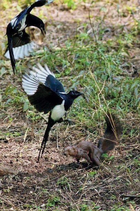 松鼠也是喜鹊偶尔会捕猎的对象,不过,松鼠生性机警,行动灵敏,想要捕捉它可不容易,一般喜鹊会两三知合作,有正面骚扰的,有在后面堵截的,还有在侧面袭击的,总之,捕捉松鼠可不是一件轻松的事情,成功率并不高,也只有经验丰富的老喜鹊才有这个能力。