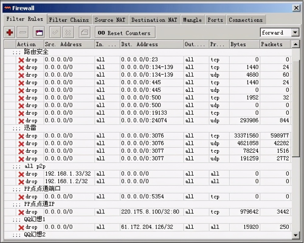 这项比较简单,IP—firewall—Destination。先看图: