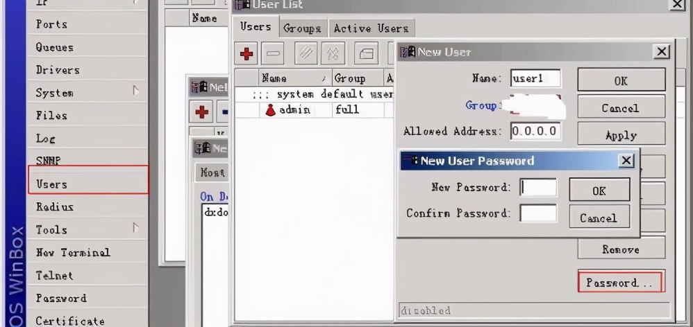 (7)配置的差不多了,该改管理员账号了,左侧USERS,双击ADMIN改个名字和右下脚的password,如果不需要远程修改ROS的话,可以设定访问IP,192.168.1.0/24之类的