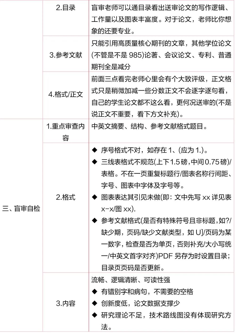 - 内容只要不是太差,盲审主要还是看格式!!!尤其有的导师可能自己没那么多精力,会让博士生或者优秀的硕士生来帮忙盲审。这些学生能在内容上对你评价吗?即使能也是一知半解,更多的还是在格式上!格式其实代表着你的态度,态度不好别人肯定不会让你好过的!