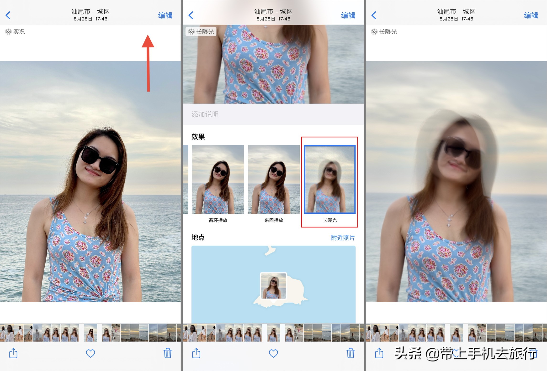 拼图说明:《在“相薄”应用照片界面截屏,从“实况”到“长曝光”效果呈现路径拼图》(《海风微微》),拍摄完成后进入“相簿”应用,在对应的照片界面上拉照片,选取下方面的“长曝光”,画面呈现两种姿态叠加的双重影像效果。