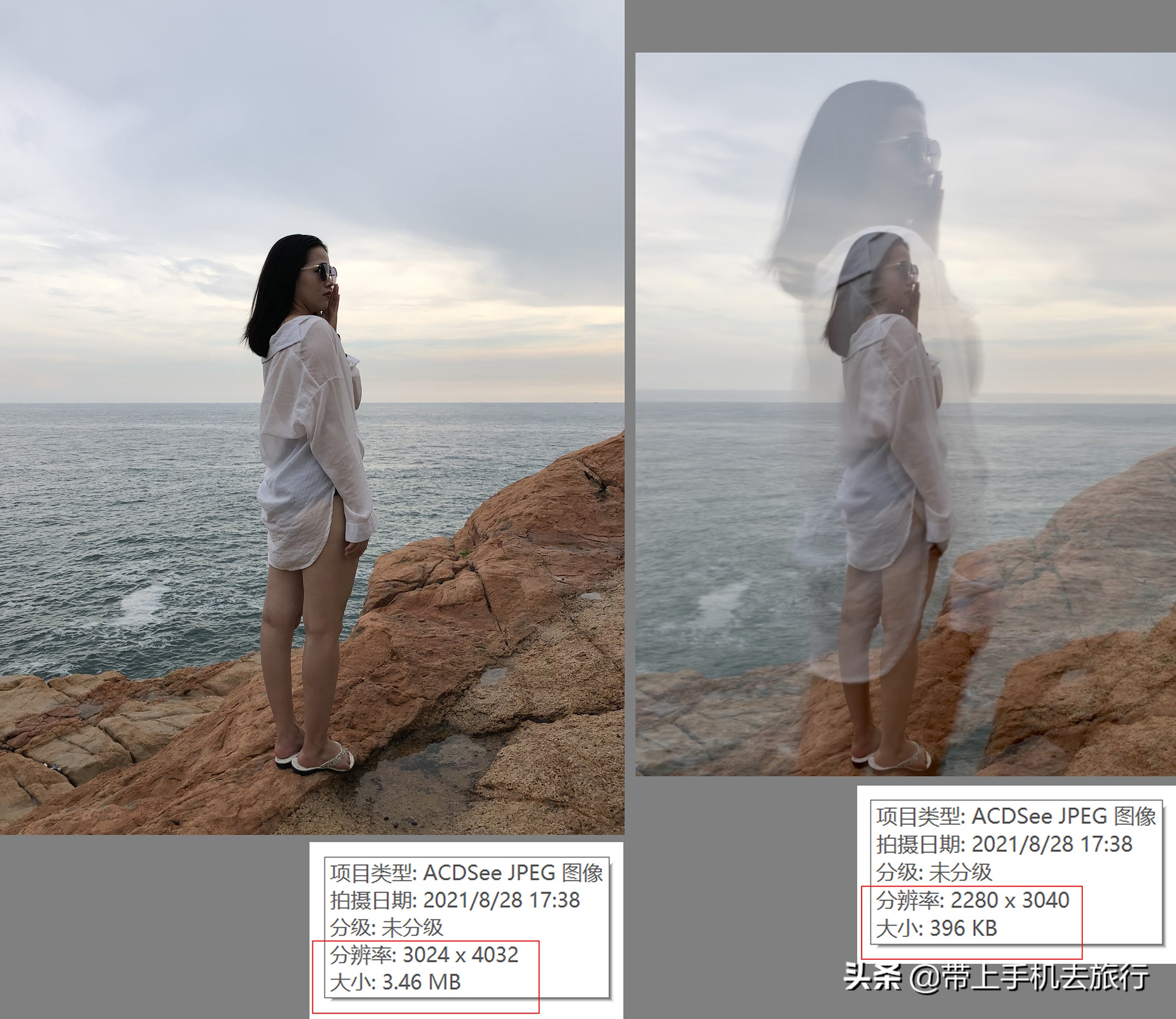 《默认的“实况”效果与“长曝光”效果照片大小对比拼图》