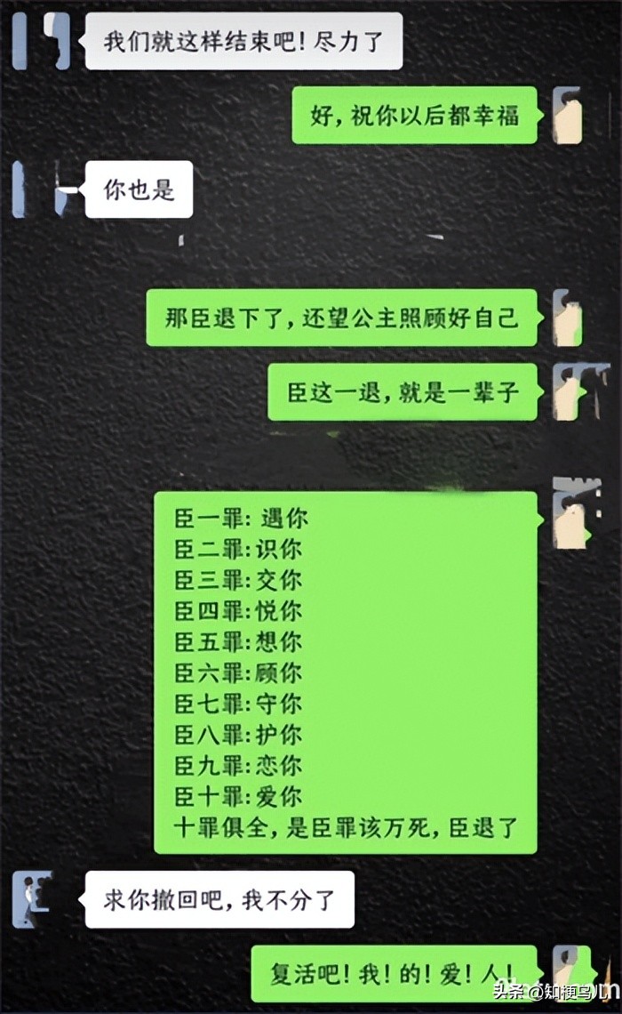 看完鸡皮疙瘩都出来了,这一段分手土味情话,堪称互联网复古尴尬文学顶流。不过这个表达还是很有点悲壮气势的,一般是用来表达分手但不甘的心情,或者是舔狗舔到最后一无所有,准备彻底放下离开时的不甘。