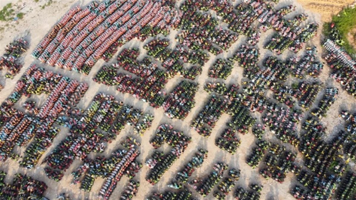 广州市黄埔区一处空地上,堆放着上千辆被收缴的共享电动单车(图片来源:每日经济新闻)