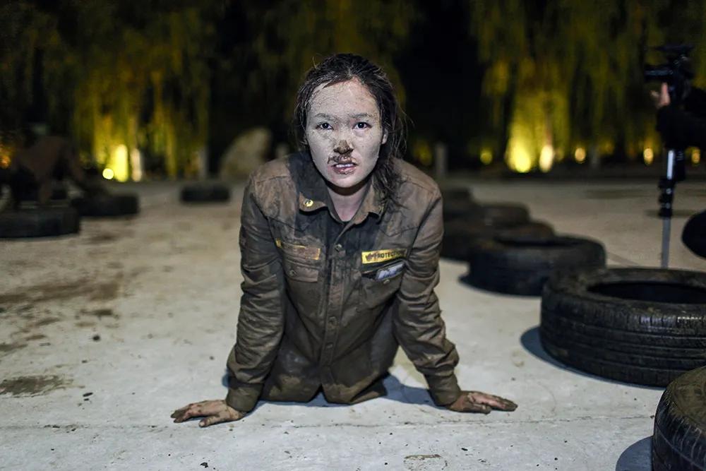2013年11月1日,北京,一位女保镖刚刚经历过泥地匍匐。