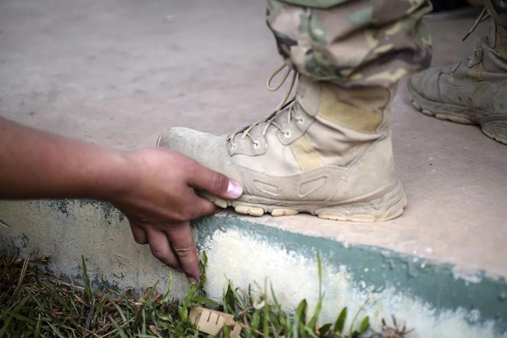 2019年3月24日,老挝万象,在枪械训练科目中不及格的学员被踩手指。