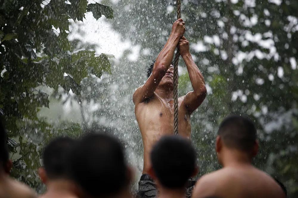 2013年8月16日,北京,保镖训练生在高压水枪的冲击下缓慢的爬上缰绳。