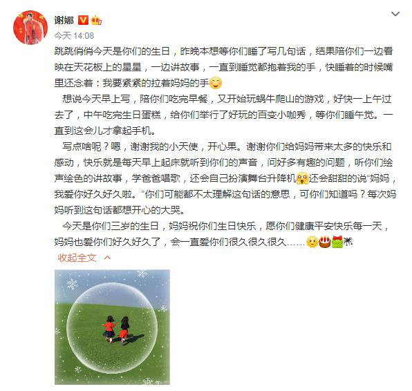 谢娜感性记录下与女儿们的相处时光,表示“今天是你们三岁的生日,妈妈祝你们生日快乐,愿你们健康平安快乐每一天,妈妈也爱你们好久好久了,会一直爱你们很久很久很久……”