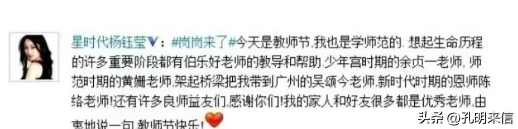 教师节的到来,久无音讯的杨钰莹破天荒地在社交媒体上发布了一条消息。