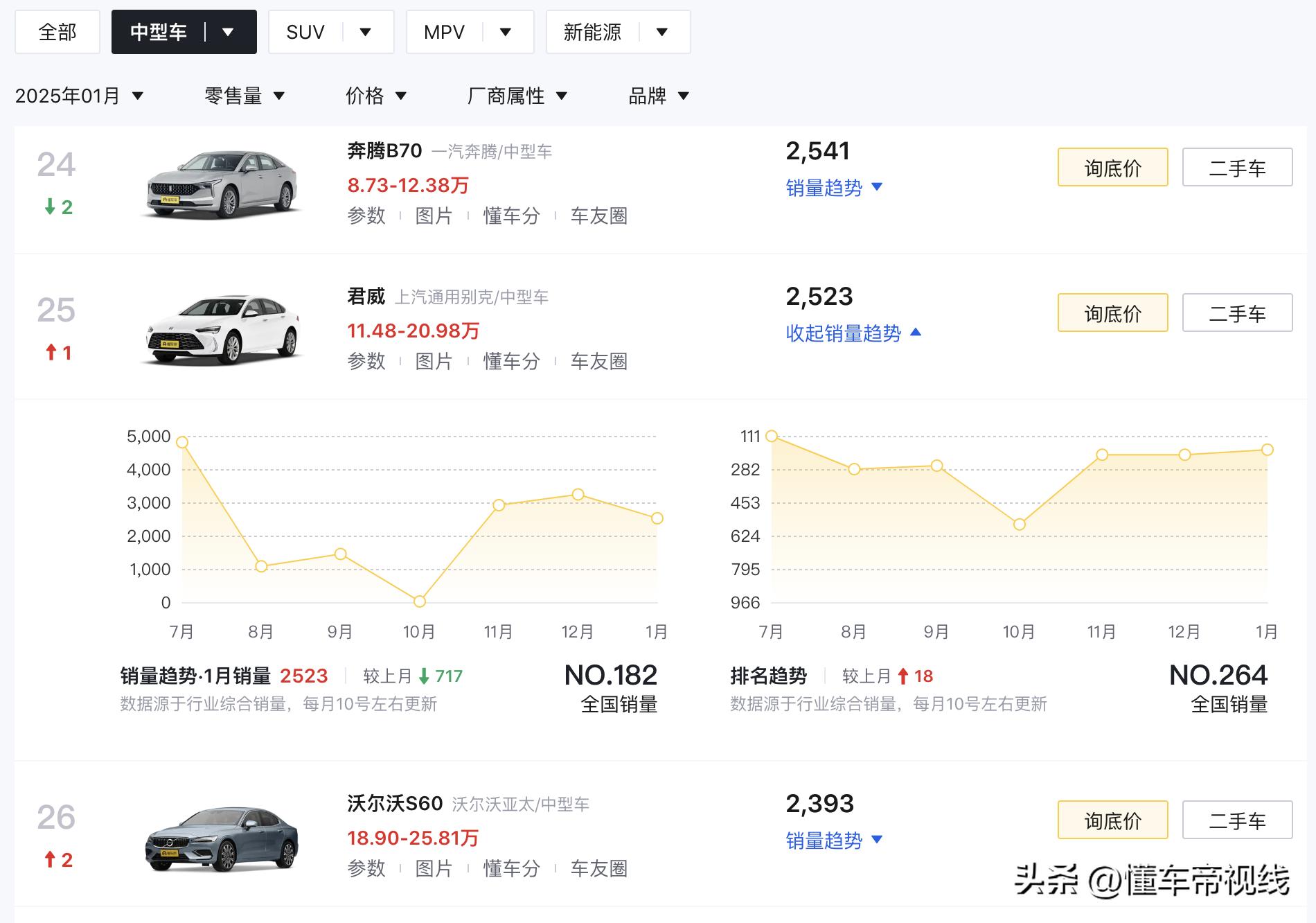 基于合资品牌中型车定位来看,别克君威同级竞品包括上汽大众帕萨特(指导价16.45万-23.99万元)、一汽-大众迈腾(指导价17.49万-24.69万元)、广汽本田雅阁(指导价17.98万-23.88万元)等主流车型。参考销量来看,别克君威1月销量为2523辆,位列当月中型车销量榜第25位。有关别克品牌的更多消息,我们将保持关注。