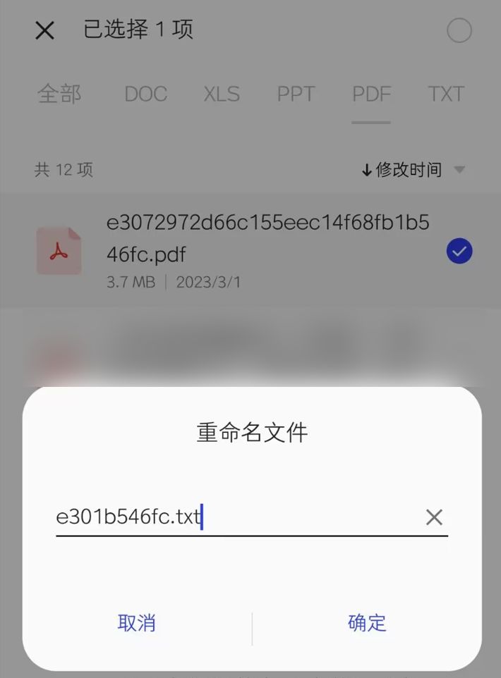 我们手机自带的文件管理器支持对文件进行重命名,我们可以用它将PDF文件的后缀名修改成TXT格式,得到格式转换的效果。