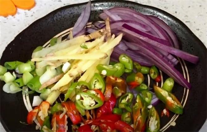 4.趁这个时间切一点洋葱,生姜和青红辣椒。