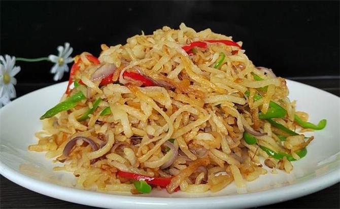 陕北名小吃洋芋擦擦,分享地道农家做法,简单美味,好吃又下饭。洋芋擦擦是陕北、山西晋西,甘肃陇东等地的汉族传统面食之一。用不起眼的土豆做成的洋芋擦擦,色泽金黄的土豆泛着淡淡的油光,土豆的清香洋溢开来,吃上一口,既有薯条的口感和嚼头,又有青红椒的鲜香。洋芋其实就是土豆,擦擦是一种工具,用来擦土豆丝的。其以土豆为主料,加少许白面加工制成,深得陕北人喜爱,今天就把详细做法分享给大家。