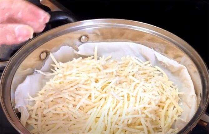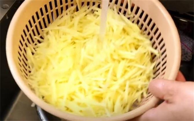 1.准备两个削皮的土豆,把它擦成丝,用清水洗去多余的淀粉,然后控干水分。