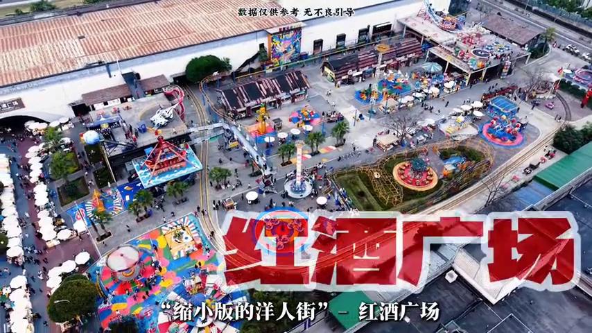 而在渝北区还藏着一个缩小版的洋人街"-红酒广场,广场里面是各种游乐设施,右边是金渝地铁站,周边是居民区,苏宁易购、宜家、和奥特莱斯等大型商场,而集市就分布在红酒广场的两侧。