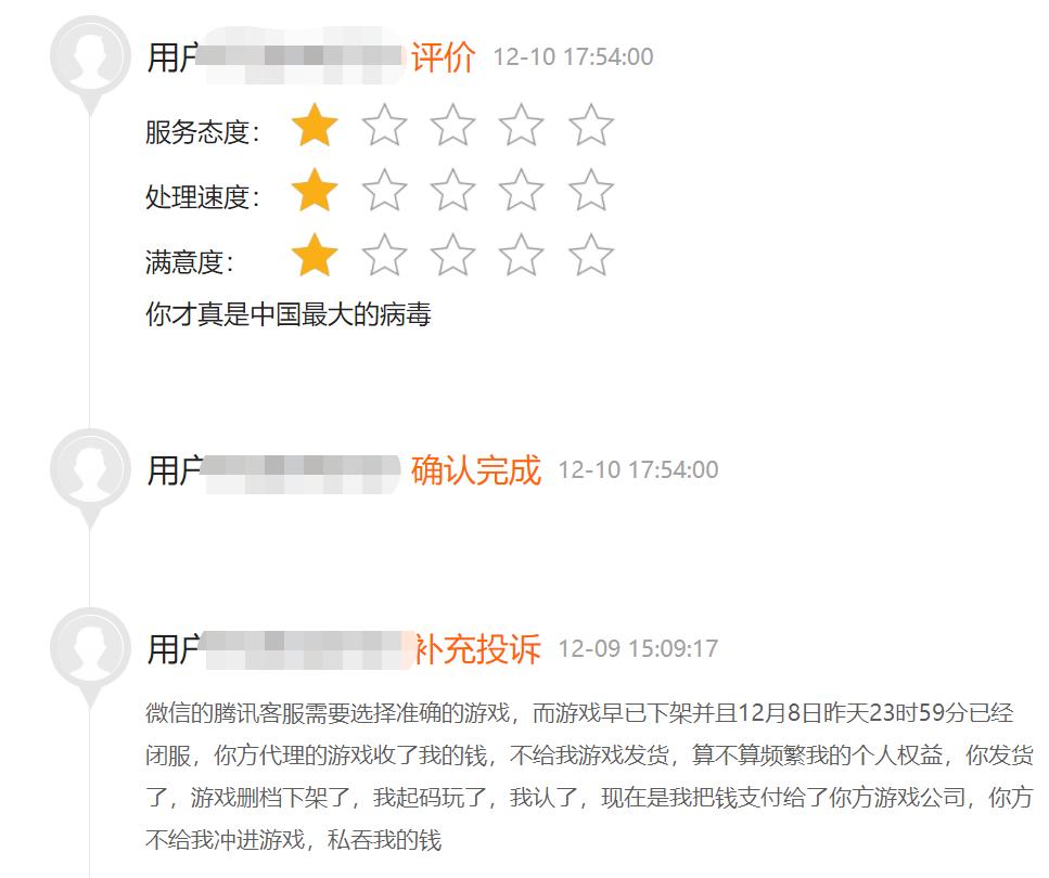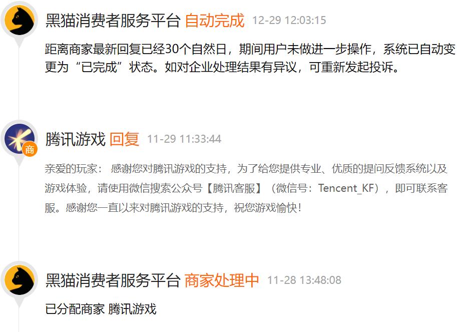 在黑猫投诉平台上搜索“罗布乐思”,存在着44条用户投诉,多与“申请退款/提现不到账”有关。据用户反映,之前说“全平台开放的”罗布乐思,“在12月8日下午2点发出通知晚上23时59分进行删档闭服”,并存在没有及时退款的情况。 上述投诉大多处在已回复、已完成的状态。腾讯游戏对此的回复,多将玩家引向了腾讯客服。而根据网页提示,黑猫投诉平台的“已完成”指距离商家回复过去30日后用户未做进一步操作的默认状态。