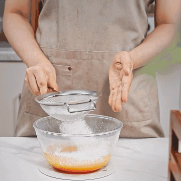 搅匀后倒入剩下的蛋白霜中,轻柔地翻拌均匀,最后成颜色一致,Q弹的蛋糕糊,装入裱花袋中