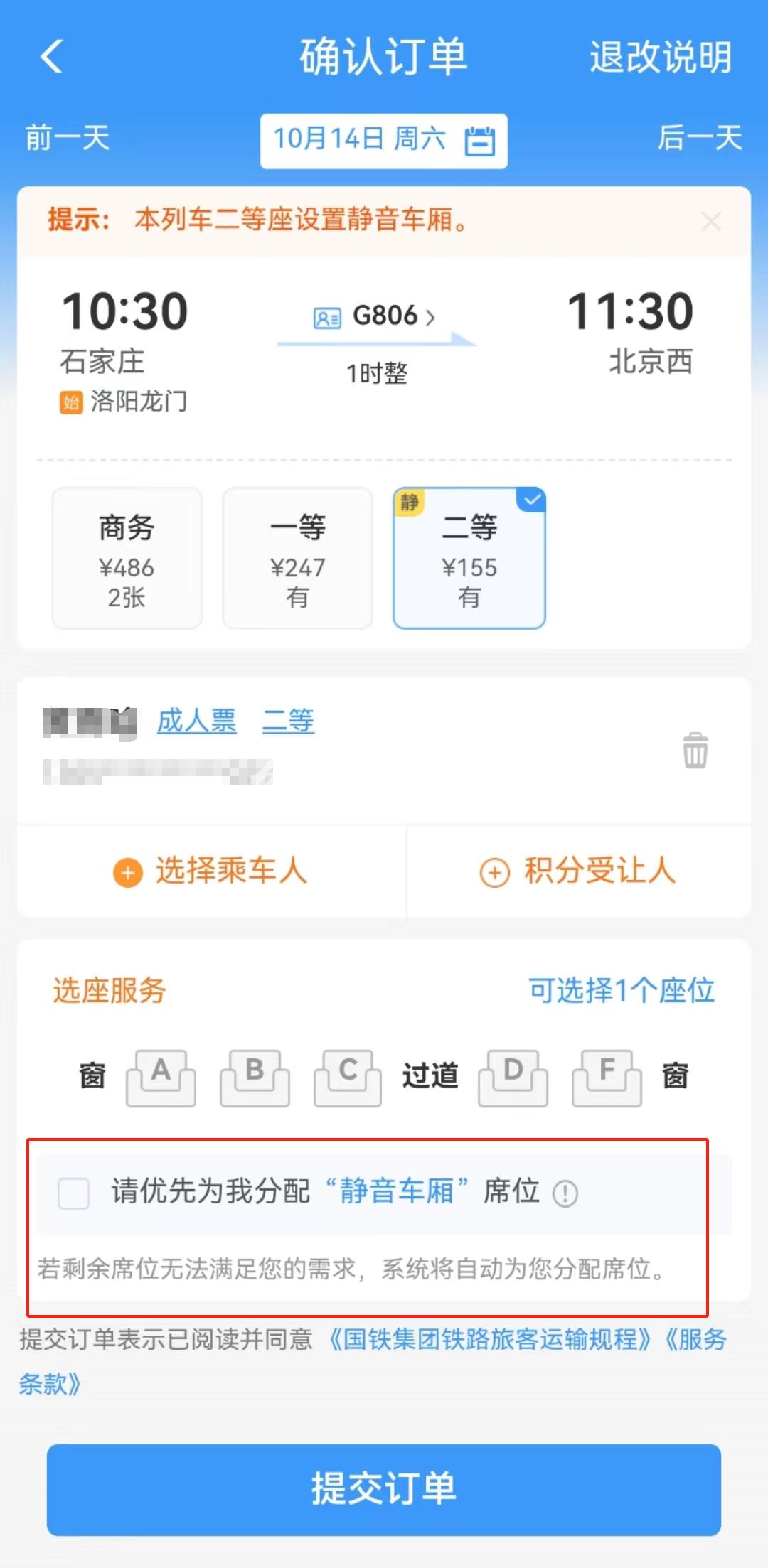 确认订单页面有“请优先为我分配静音车厢席位”选项。(图片来源/铁路12306APP截图)